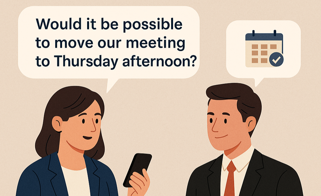 今日のKeyフレーズ “Would it be possible to move our meeting to Thursday afternoon?” 「会議を木曜の午後に変更することは可能でしょうか?」 Voice By ondoku3.com 業務における本フレーズのポイント 丁寧に依頼する → “Would it be possible to …?” ... -